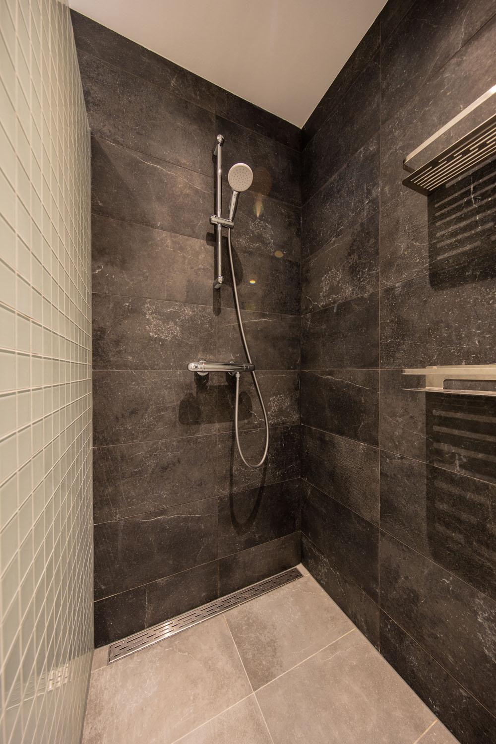 Dark walk-in shower at Krekelstraat in Rotterdam with slate-look tiles and a modern hand shower. The combination of dark walls and light floor creates an elegant contrast.