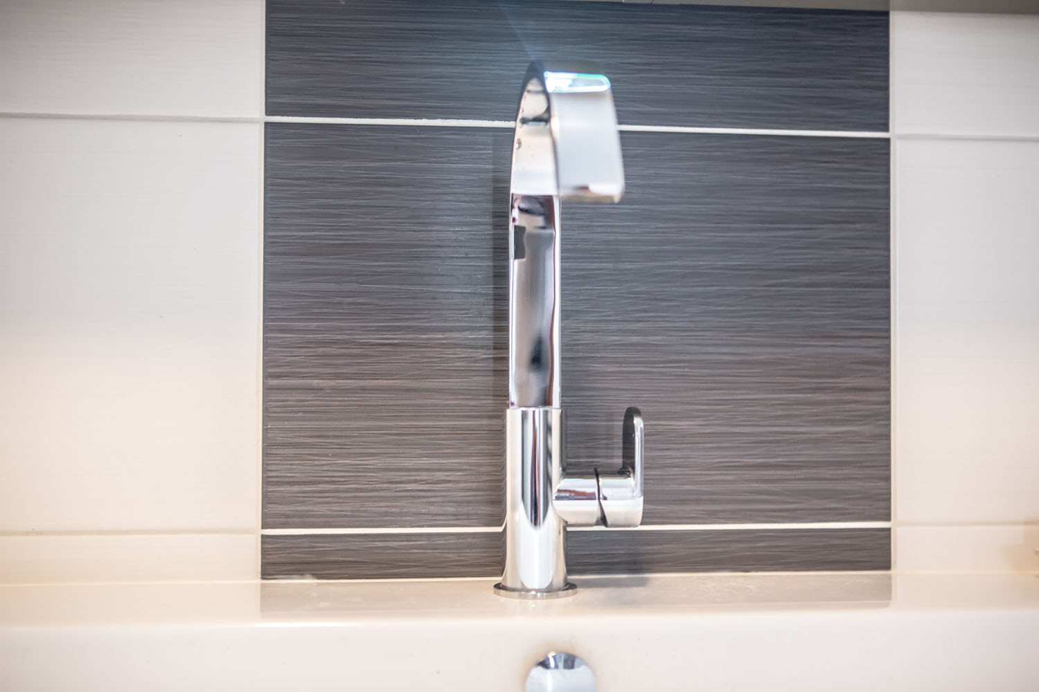 Badkamerrenovatie aan de Architect Krophollerstraat in Den Haag met een moderne chromen kraan en donkere accenttegels. Strakke lijnen en een compacte indeling maken deze badkamer functioneel en elegant.